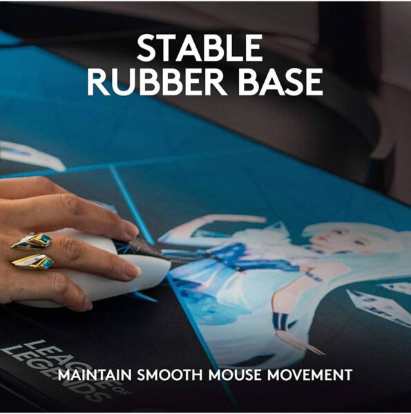 Specifications for Logitech G840 XL League of Legends KDA Gaming Mouse Pad, 900x400mm, Performance Tuned Surface, Stable Rubber Base, Moderate Surface Friction, Black – Blue | 943-000458